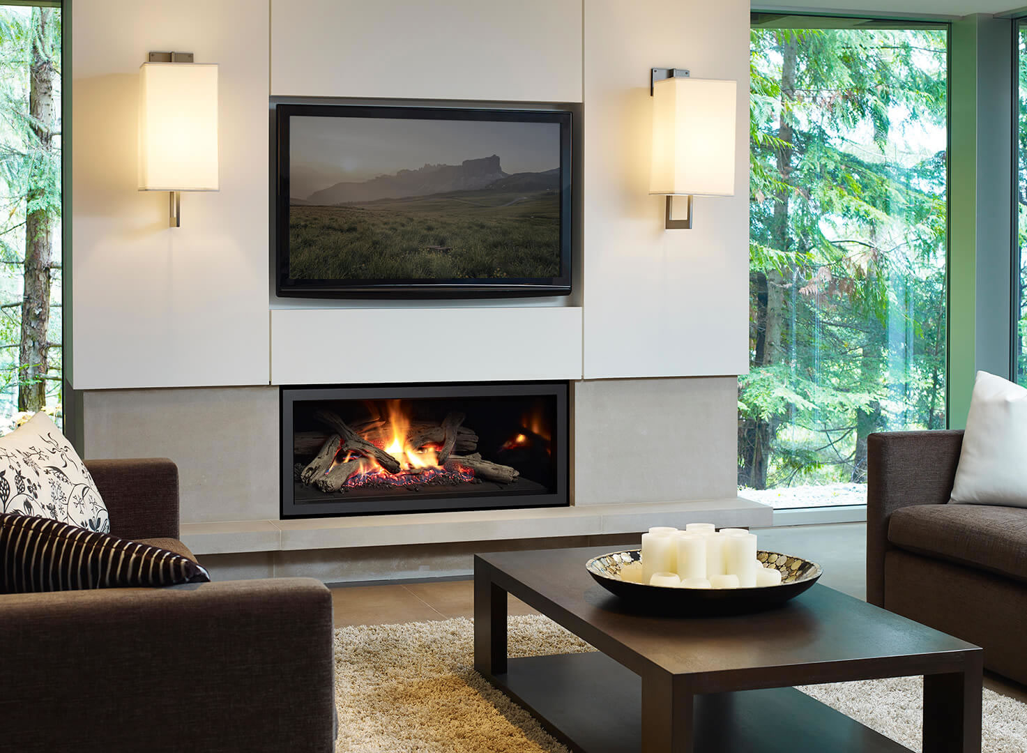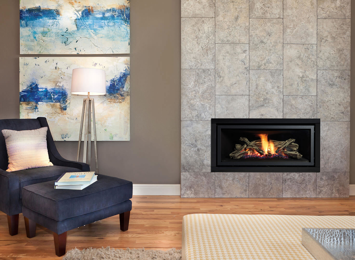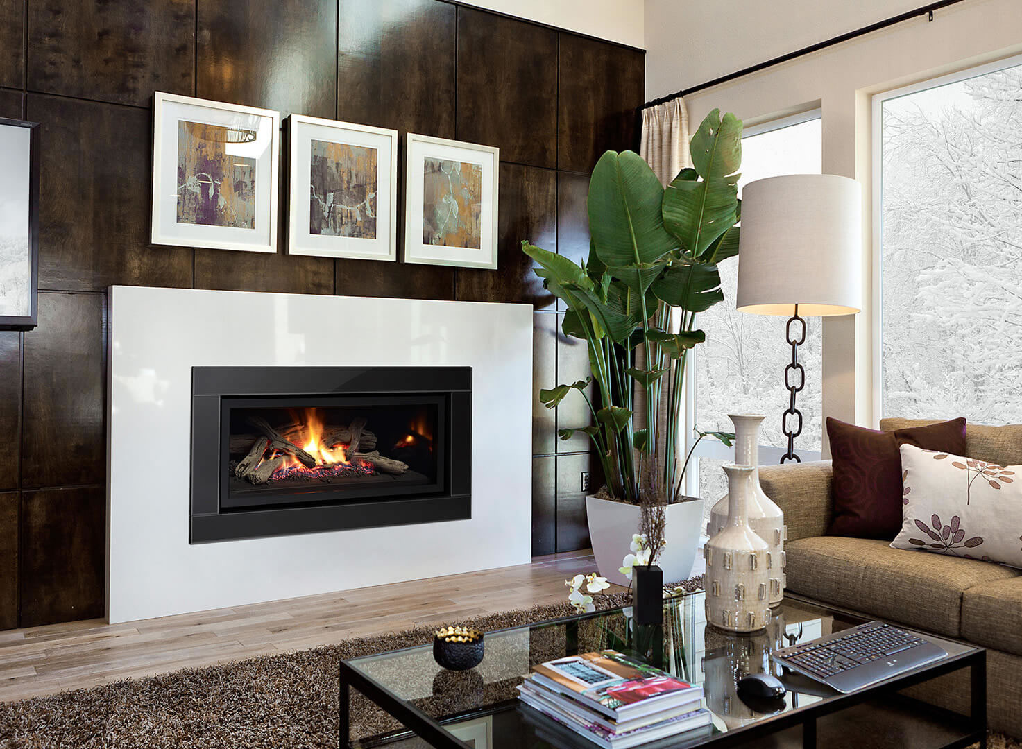 Regency’s Ultimate gas fireplace (U900) is perfect for contemporary decors and open-plan spaces. It distributes clean heat throughout the home. In cold weather, it effectively combines intense radiant heat with continuous convection heating thanks to the built-in blower. Black reflective enamel panels accentuate the glow of the fire to create the perfect ambience. Standard features of the Ultimate 900 gas fireplace include: natural or propane gas; protective screen, linear glowing ember bed; ceramic burner and imitation driftwood log set; black enamel reflective side panels; three-speed blower; electronic ignition; remote-controlled Proflam II system; heat exchanger and direct venting.