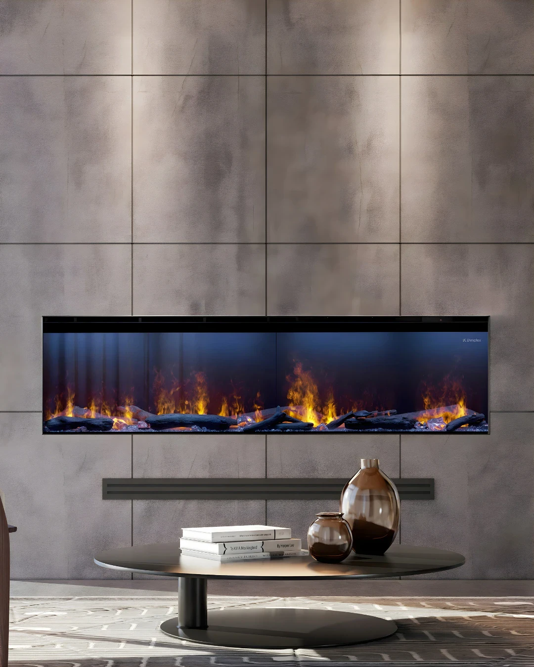Dimplex Optimyst Linear : foyers à vapeur d’eau 46/66/86″ avec chauffage Comfort$aver (selon tension), air neuf obligatoire, 120/240 V, option plomberie. Commande Flame Connect. Installation pro Noréa GM.
