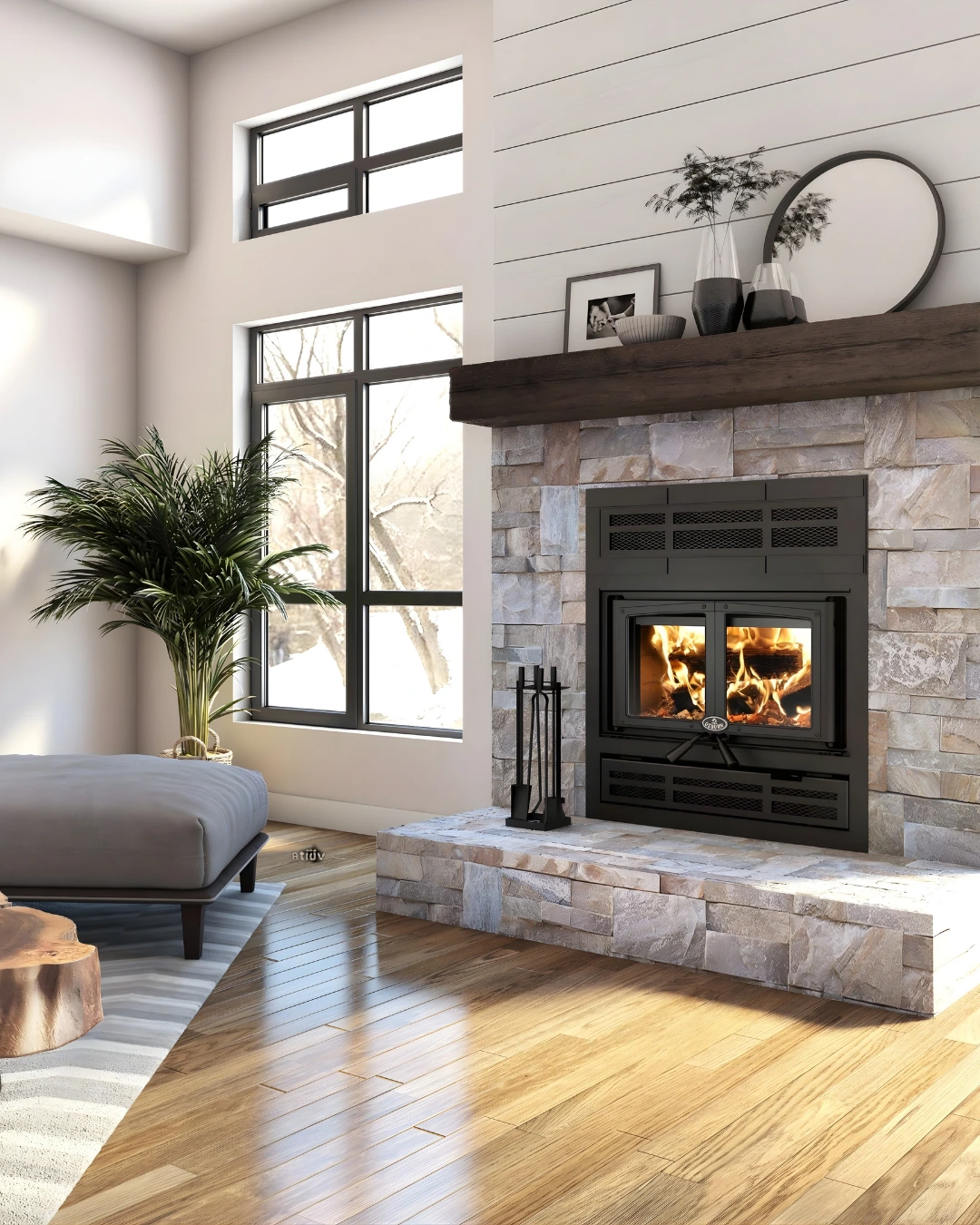 Le ventilateur intégré (jusqu’à 176 CFM) dynamise la convection. En option : kit de gravité (circulation passive vers les pièces adjacentes) et kit d’air pulsé (canalisation vers une autre zone). Une prise d’air frais 4″ peut aussi être ajoutée selon la configuration de la maison.